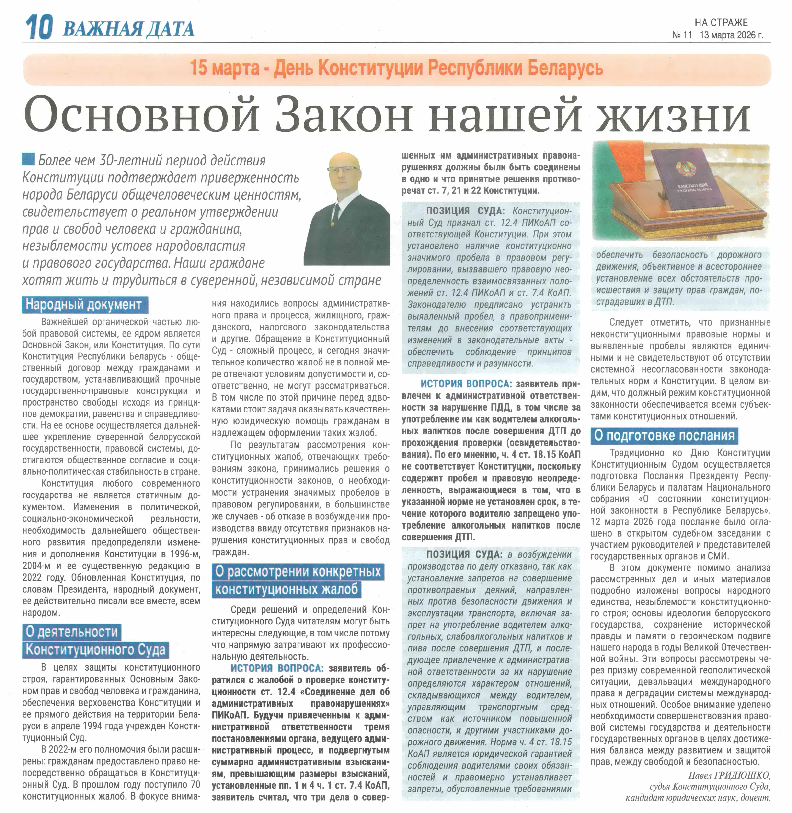 Интервью судьи Конституционного Суда Республики Беларусь П.В.Гридюшко газете «На страже» (На страже № 11 (7867). 13 марта 2026 г.)